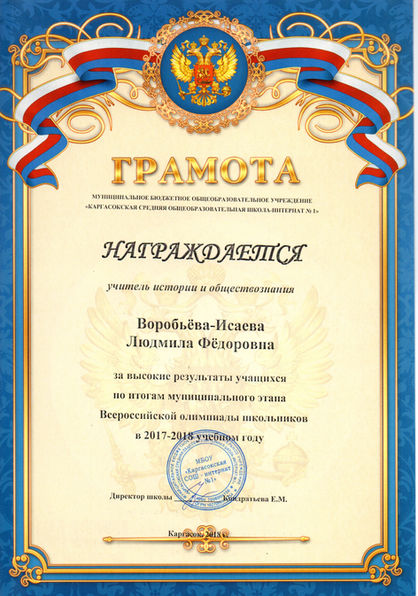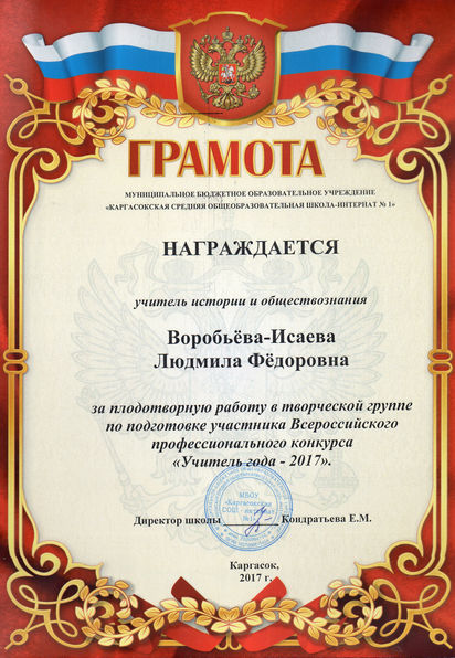 Грамота МБОУ «Каргасокская СОШ-интернат №1» за наибольшее количество призовых мест во Всероссийской Олимпиаде Школьников и активное распространение педагогического опыта на муниципальном, региональном и федеральном уровнях. Методическому объединению учителей предметов общественного направления (рук. Воробьёва-Исаева Л.Ф.). 2017.